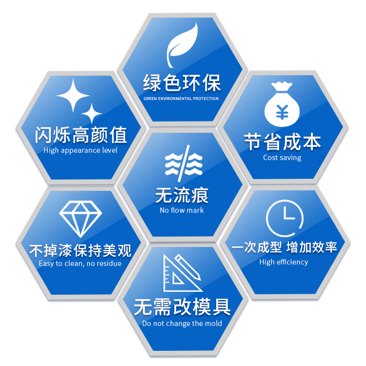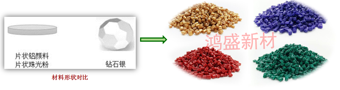 “鴻盛無流痕免噴涂塑料”:是一種立體閃爍效果顏料,這種顏料以鉆石晶體為靈感研發(fā)而成,采用特殊工藝將球形鋁顆粒加工成規(guī)整的鉆石銀多面反光體,顛覆傳統(tǒng)片狀顏料的形態(tài),從而降低了客戶在使用過程中對顏料片定向的要求,其三維立體構(gòu)型在塑料熔體中不容易發(fā)生取向,無論怎么流動,始終均勻反射,從根本上解決了流痕、熔接線的問題。