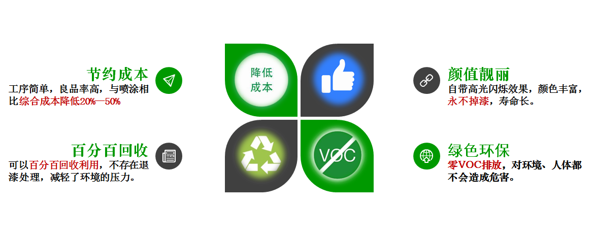 噴涂塑料以色彩鮮艷的“高顏值”而風靡市場,但在可持續性發展的大環境下,傳統噴涂行業一度飽受詬病。噴涂過程中不僅污染環境,高危、高傷害性的的噴涂作業環境還會對生產線工人造成嚴重的健康隱患,噴涂產生的voc氣體也導致了霧霾的加重。