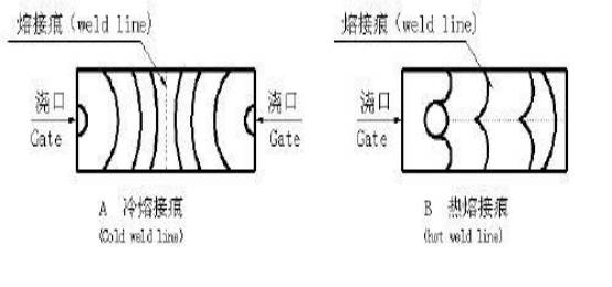 熔體在交匯位置處發生金屬顏料或者珠光顏料的堆集(導致樣件不同部位密度不同所產品的視覺差異)產生熔接痕。
