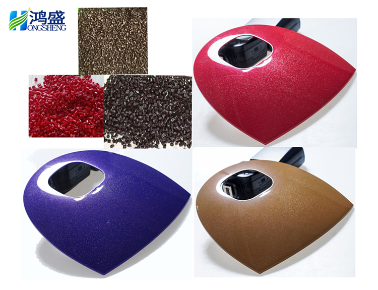 免噴涂塑料是在塑膠原料(PP、ABS、AS、PC等)中通過熔融共混的方式加入具有不同顯示效果的:金屬粉、珠光粉、陶瓷粉、高光色粉等,使其自帶特殊色彩效果。