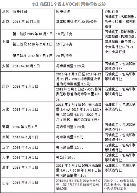 這是我國從國家層面利用經濟手段控制VOCs的排放,該辦法出臺后,以北京、上海、安徽為首的11個省市相繼正式發布文件通知試點開征VOCs排污費。