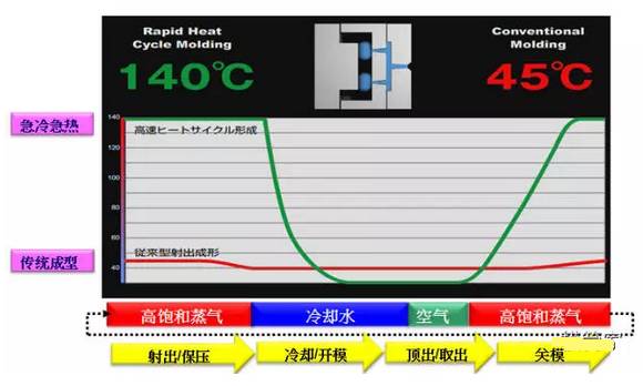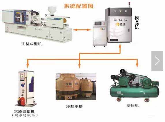 注塑完成后,打入高壓冷卻水使模具溫度迅速下降到樹脂變形的溫度以下。這樣的循環周期,就會形成沒有結合線且表面高光亮的產品,若模具表面是蝕紋處理,其產品紋理更加清晰美觀。以下為急冷急熱制程配置附圖: