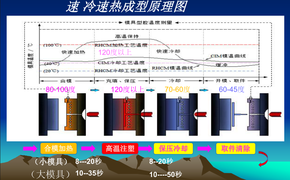 急冷急熱注塑工藝指在注塑前向模具水路吹入高溫高壓汽水混合物,使模具的溫度迅速上升達(dá)到高分子材料轉(zhuǎn)變溫度至Tg以上,注入熔融樹脂。