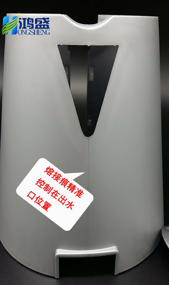 這個(gè)產(chǎn)品就是一個(gè)典型案例,通過進(jìn)膠口及注塑方式的變動(dòng),左圖我們把熔接痕逼到了把手位置,這樣等組裝上把手后,就掩蓋了熔接痕的缺陷,從而不影響美觀。右圖我們把熔接痕較好的控制在出水口位置,直線正對(duì)著倒三角的尖角處,這樣看起來有點(diǎn)像是刻意的線條,很大程度上降低了熔接線對(duì)產(chǎn)品美觀度的影響。