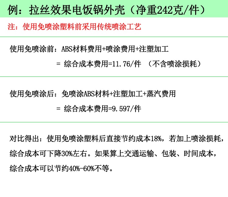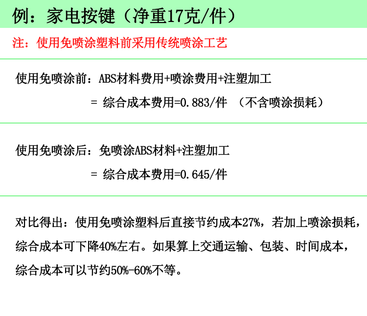 很顯然,這個老板問出了很多注塑廠家的心聲,比較大程度節省成本是每一個生產廠家的生產準則,因此很多廠家在了解完免噴涂塑料比塑料原料價格高后便望而止步。殊不知整個生產過程完成下來,免噴涂塑料可以為廠家節省的成本高達百分之三十至百分之五十。