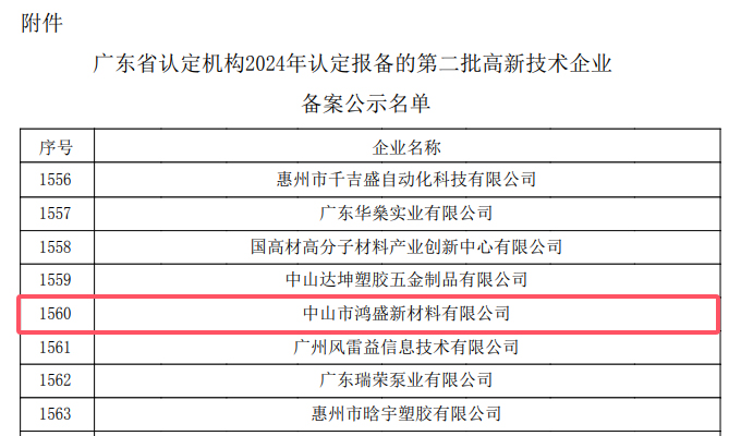 喜報(bào):中山鴻盛新材料再次榮獲高新技術(shù)企業(yè) 近日,全國高新技術(shù)企業(yè)認(rèn)定管理工作領(lǐng)導(dǎo)小組辦公室根據(jù)有關(guān)規(guī)定,公示了廣東省2024年認(rèn)定報(bào)備的第二批高新技術(shù)企業(yè)名單,中山鴻盛新材料有限公司再次通過認(rèn)定,被授予“國家高新技術(shù)企業(yè)”稱號,這是公司自2018年首次被認(rèn)定為高新技術(shù)企業(yè)以來,第三次成功通過高新技術(shù)企業(yè)認(rèn)定。